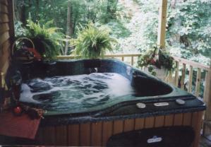 Covered private deck with luxurious hot tub looks over rushing stream. Deck with Rockers and Charcoal grill perfect for the catch of the day.